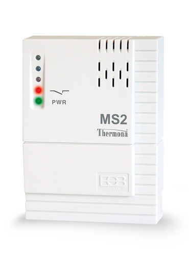 MS 2 is an external module for the boiler and cascade boiler room malfunction alarm system. The body of the MS 2 alarm module is connected to the PT 59 X regulator (PT 55 X). When there is an error message from the thermostat, or the connection between MS 2 and PT 59 X (PT 55 X) is interrupted, the MS 2 relay idle contact closes; it can be connected to another light or acoustic component (such as bulb, indicator, horn, siren, etc.). The module is frequently used in technically advanced cascade boiler rooms where it immediately informs the operator of any issues in connection with the GSM module GST 1.